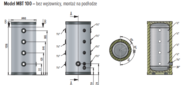 Dla modelu MBT 100 możliwość podłączenia wielu źródeł ciepła, dzięki dużej ilości złączek przyłączeniowych - 8 szt., o średnicy 1 1/2"